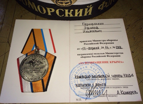 Активисты нашли на странице российского военнослужащего в социальной сети «ВКонтакте» фото медали и наградного удостоверения «За возвращение Крыма», пишет Центр журналитсских расследований.