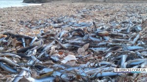 Керченское побережье усеяно хамсой. В районе перемычки, рядом с селом Челядиново, хамсу выбросило на берег. Рыба покрывает плотным ковром песок большой участок побережья.
