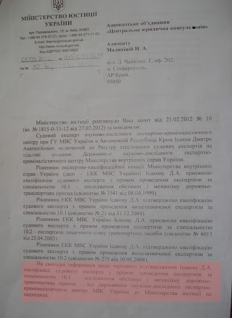 И еще один момент. На запрос адвоката в Министерство юстиции о том, подтвердил ли эксперт Исаков свою квалификацию на право проведения экспертизы по специальности 10.1 – «исследование обстоятельств и механизма ДТП» (подтверждается каждые 5 лет), был получен ответ: на 05.03.12г. такой информации от Государственного научно-исследовательского экспертно-криминалистического центра МВД Украины не поступало…