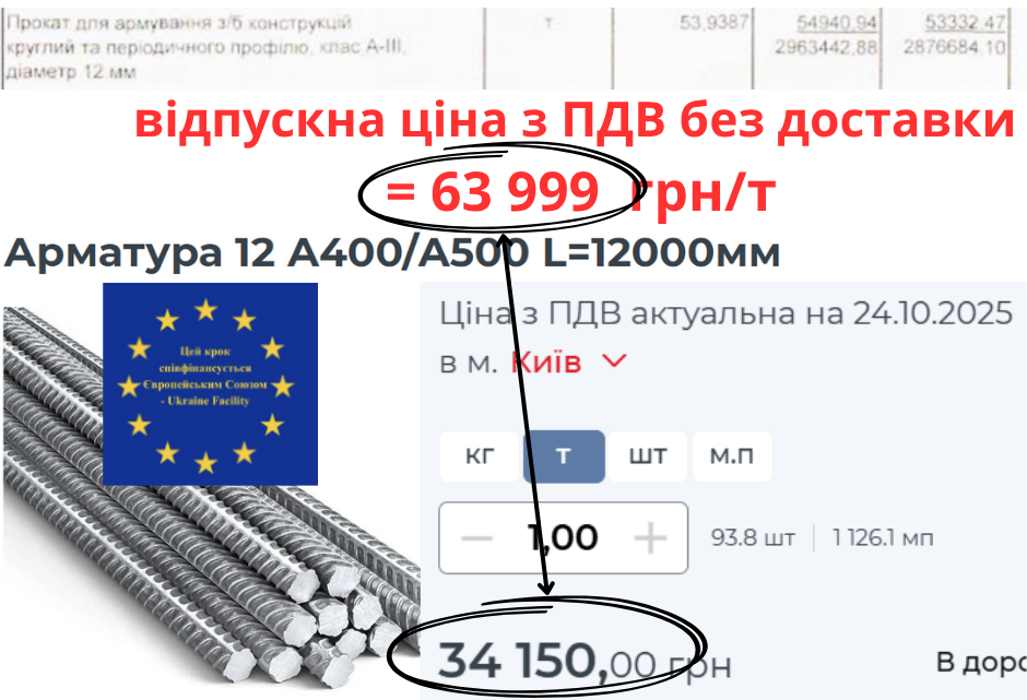 В информации о ценах на материальные ресурсы арматуру класса А-ІІІ диаметром 12 мм заказали по 63 999 грн/т. «Iron World» продает такую арматуру по 32 435 грн/т, а «Метинвест-СМЦ» предлагает ее по 34 150 грн/т. Это почти вдвое дешевле.