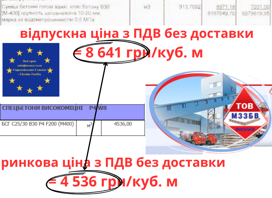 Бетон В30 (М400) учли по 8641 грн/куб. м. Доставка отдельно стоила 1913 грн/куб. м. Группа компаний Вест продает самый дорогой в своем прайсе бетон В30 (М400) Р4 W8 по 4 050 грн/куб. м, что вдвое дешевле. «Николаевский завод железобетонных изделий» предлагает свой дорогой бетон В30 (М400) Р4 F200 по 4 536 грн/куб. м, что почти вдвое дешевле. Недавно Херсонский горсовет для строительства укрытия школы заказывал бетон В30 (М400) W8 F100 по 4 400 грн/куб. м, что на 49% дешевле.