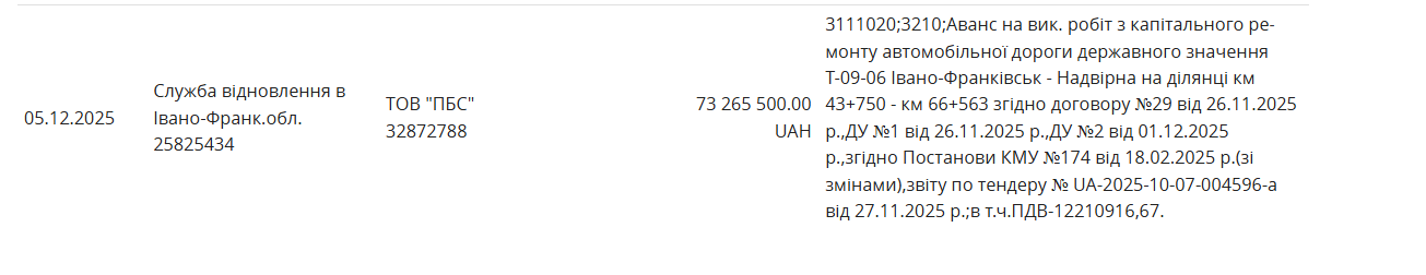 По данным портала Единого веб-портала использование публичных средств подрядная фирма «ПБС» получила авансовый платеж в размере 73,26 млн грн еще 5 декабря, то есть до публичного скандала.