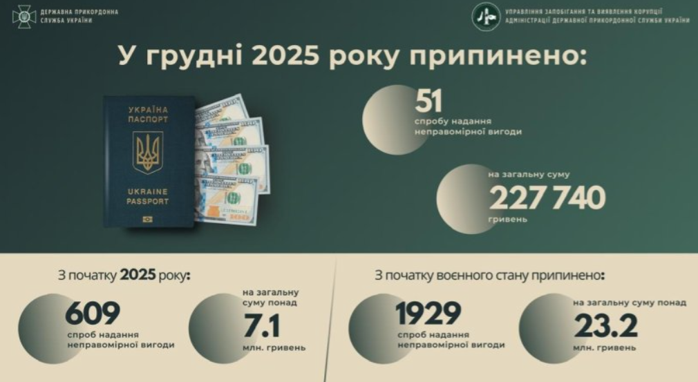 В декабре 2025 года пограничники пресекли 51 попытку предоставления неправомерной выгоды на общую сумму 227,5 тысячи гривен.