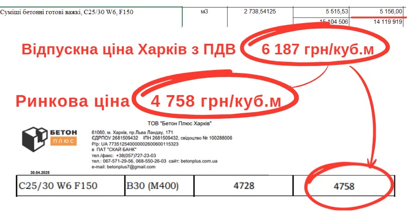 В смету бетон С25/30 W6 F150 вписали по 6 187 грн/куб. м. Харьковский «Бетон плюс» по прошлогоднему прайсу продает такой по 4 728-4 758 грн/куб. м, «Асфальтпром» – по 4 320-4 530 грн/куб. м, а «Завод Харківські Будматеріали» по свежему прайсу без указания показателей водонепроницаемости и морозостойкости – по 4 100-4 220 грн/куб. м, что на 30–50% дешевле.