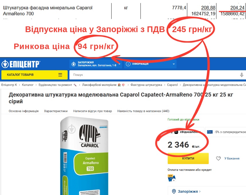 Штукатурку Caparol Capatect-ArmaReno 700 заложили по 245 грн/кг. Однако «Fasad Master», «СтройКАН» и «Епіцентр» ее продают по одинаковой цене – 94 грн/кг, что вдвое дешевле.