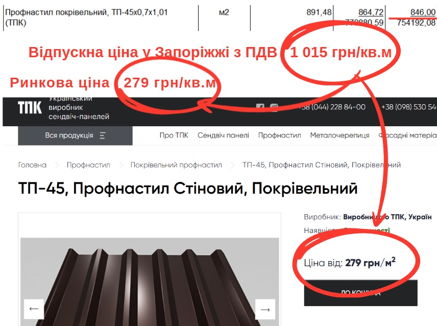 Кровельный профнастил ТП-45х0,7х1,01 компании ТПК заложили по 1 015 грн/кв. м. Хотя производитель с регионом доставки в Запорожье такой продает от 279 грн/кв. м, что в 3,5 ниже.