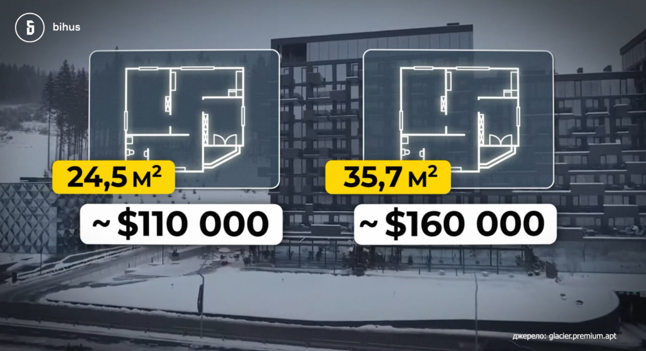- В феврале 2026 года в Bihus.Infо сообщали, что среди инвесторов люксового апарт-комплекса Glacier Premium Apartments в Буковеле, который открылся в первый день 2026 года со стартовой ценой от 4 тысяч долларов за квадратный метр, выявили родственников ряда прокуроров, а также связанных с чиновниками разного ранга людей, которые вложили в премиальную недвижимость сотни тысяч долларов.