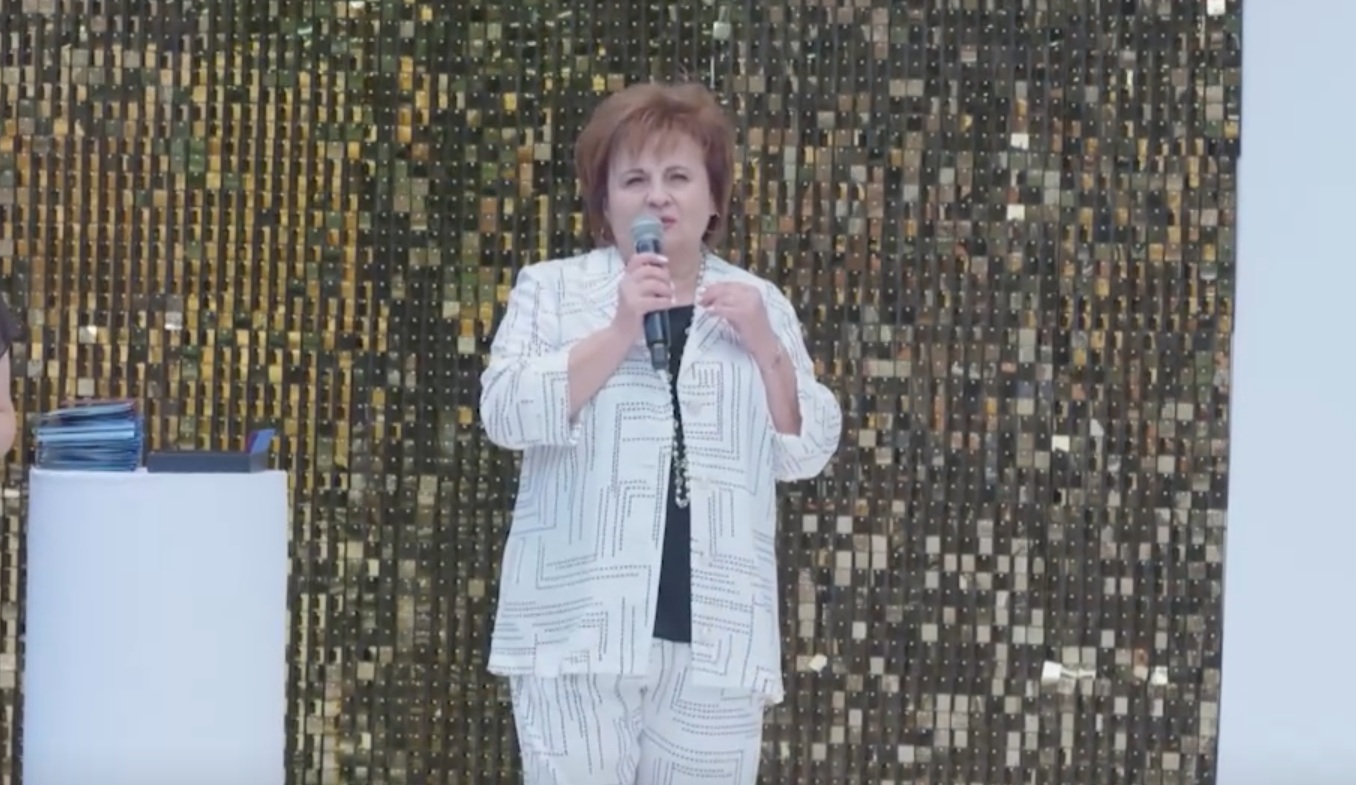 Директор средней школы №14 в оккупированной Ялте Светлана Турлакова поздравляет выпускников заведения, лето 2025 года. Фото: скриншот оккупационных СМИ
