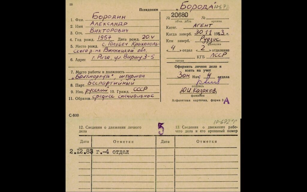 Фигурант расследования ЦЖР «Бизнес&прикрытие. Как компании «чекистов» заякорились в портах и странах ЕС» о сети компаний «Ekohidrotechnika» Александр Бородин, руководитель или основатель юрлиц в России, Кипре и ФРГ, был агентом КГБ. Об этом свидетельствует карточка агента Бородина в архиве картотеки КГБ Латвийской ССР, найденной Гуной Глейзде, расследовательницей латвийского телеканала TV.3, которая присоединилась к нашему расследованию.
