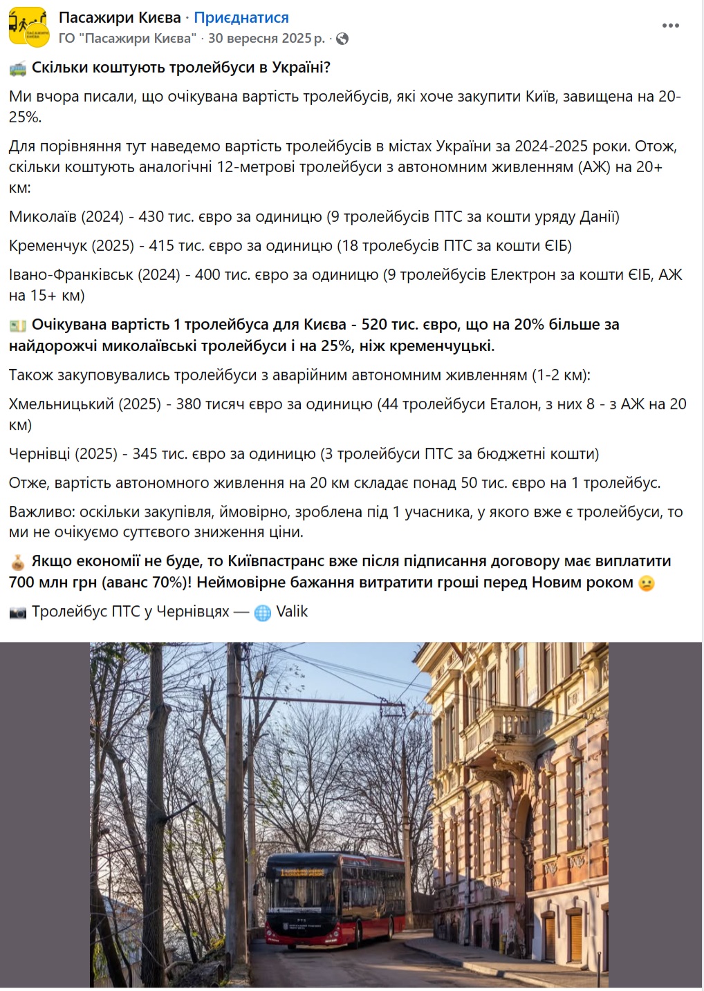 Нынешняя цена для Киева равна 378 тыс. евро. ОО «Пассажиры Киева» сообщала, что аналогичные 12-метровые троллейбусы с большим автономным питанием на 20+ км стоили: