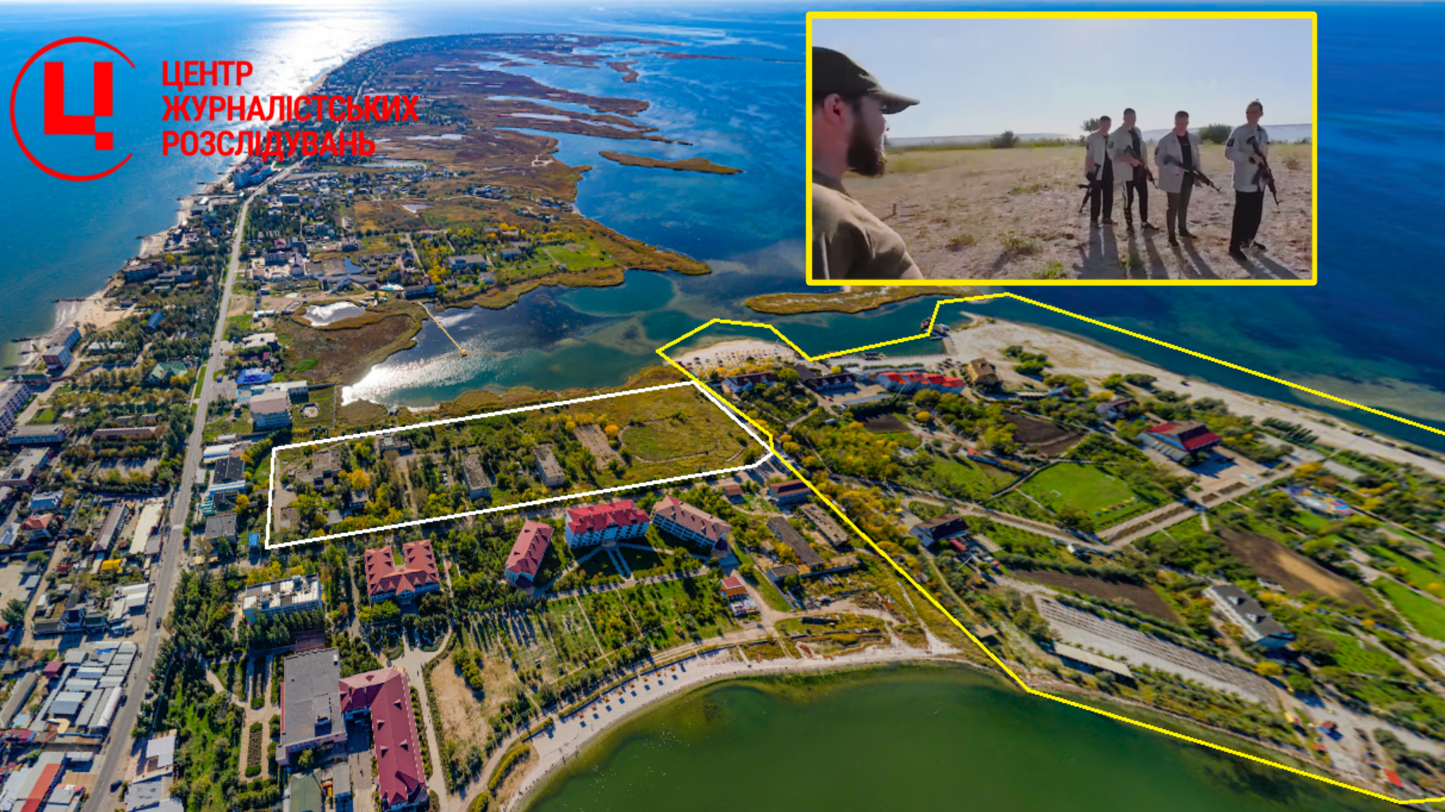 Розташування ДОЦ Іскра та Райський кутрочок на Бердянській косі і заняття з автоматами для підлітків на пляжі. Колаж: investigator.org.ua