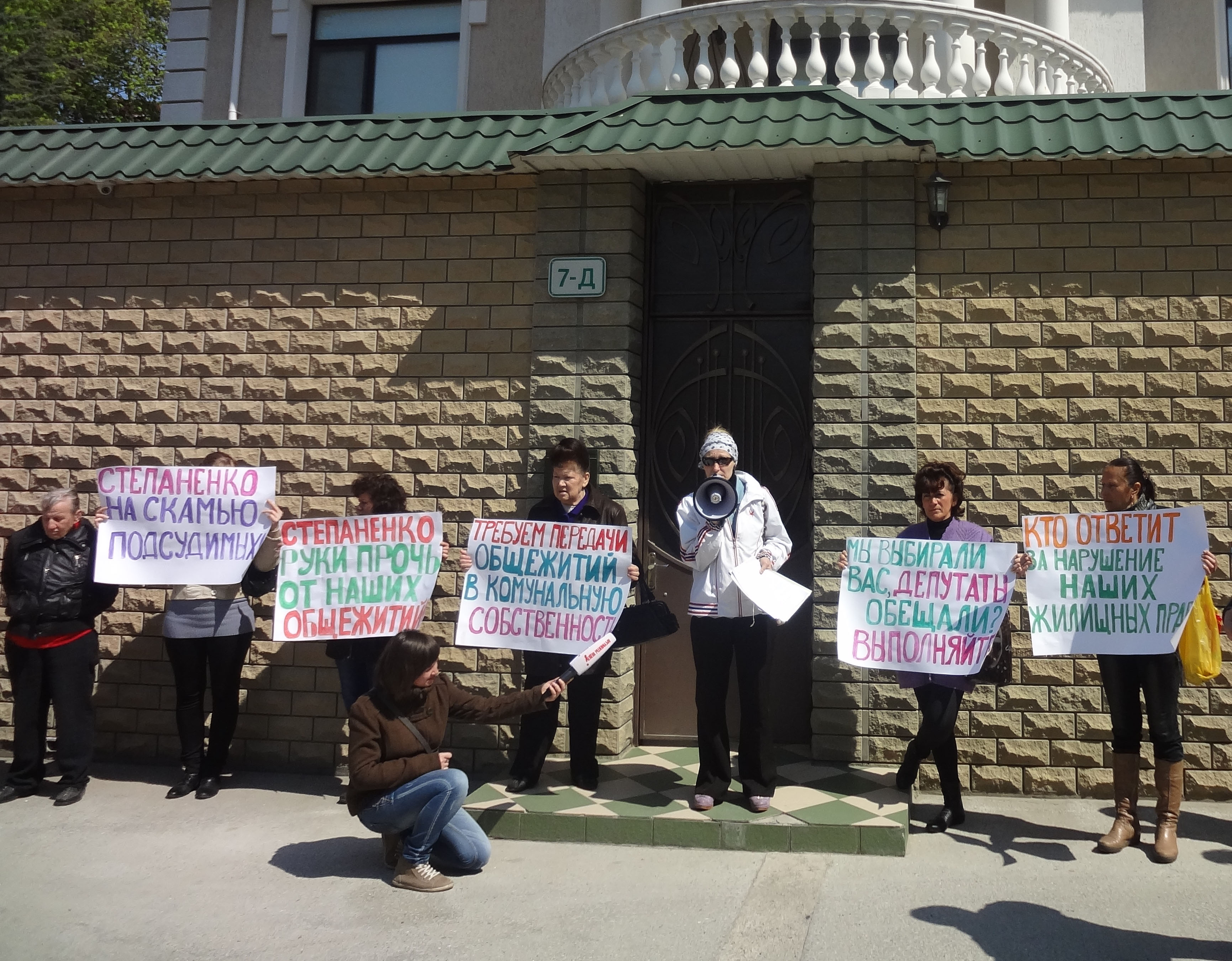 По словам жительницы общежития Елены Букиной, жильцы борются за статус общежития с 2008 года. «Директор «Крымстроя» Александр Степаненко обещал передать общежитие городу, но по своим личным соображениям не передает. Люди страдают, сидят без света, газа и воды», — говорит Е.Букина.