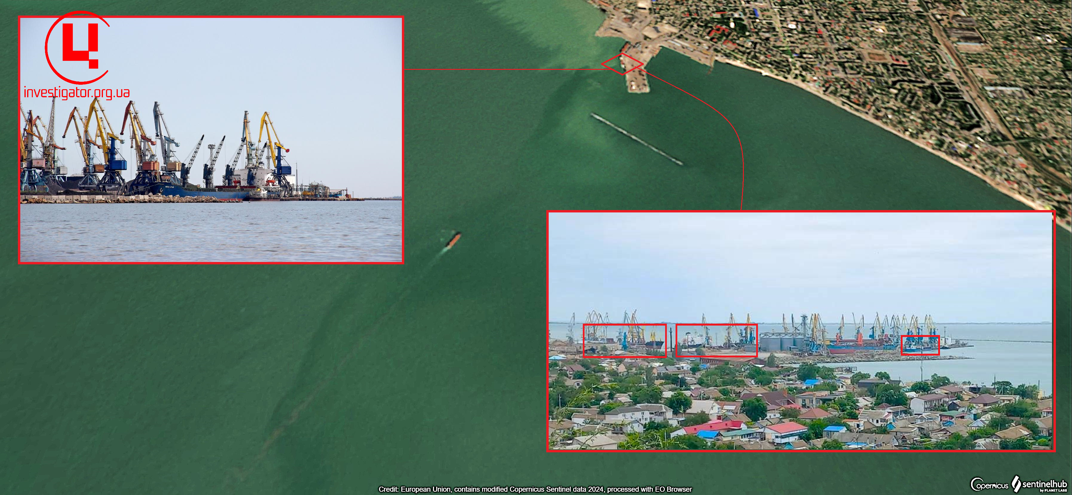 заходБалкери на причалі №8 в порту Бердянська. Травень 2024 р. Джерело фото: супутник Sentinel-2, соцмережі. Колаж: investigator.org. .ua