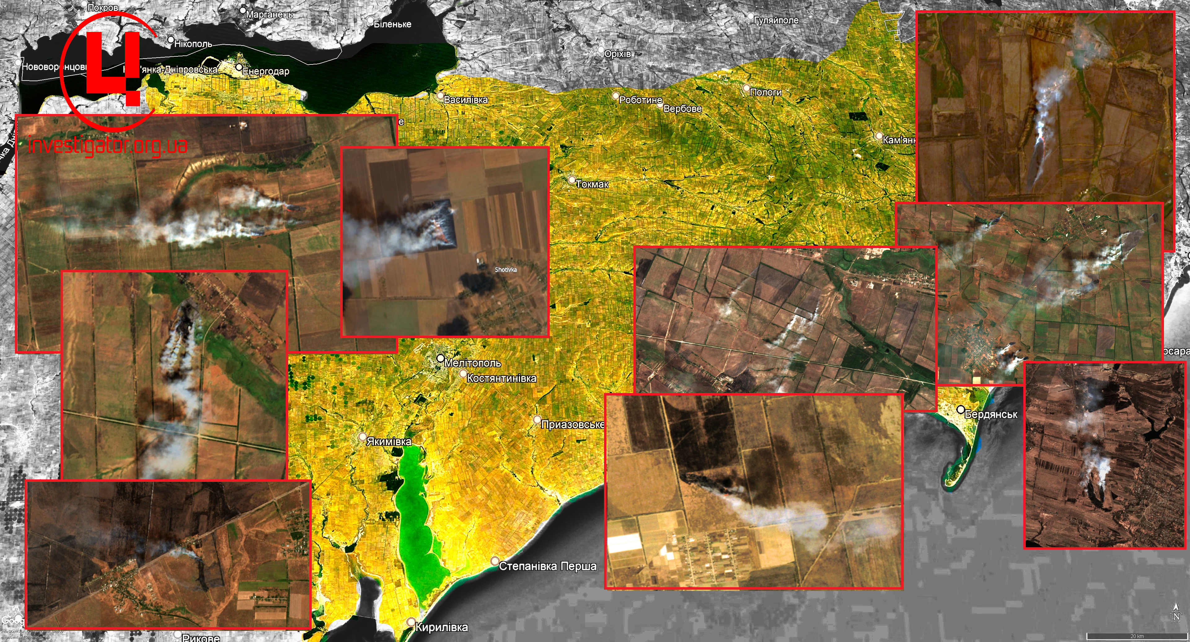 Степові пожежі в прифронтових районах Запорізької області. Липень 2024 р. Фото: Google Earth, супутник Sentinel-2. Колаж: investigator.org.ua