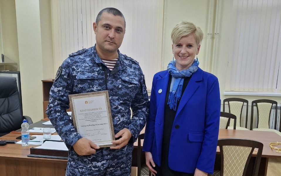 Віктор Богатуров (праворуч), обвинувачений у воєнному злочині полковник Росгвардії, серпень 2023 року. Фото з окупаційних пабліків