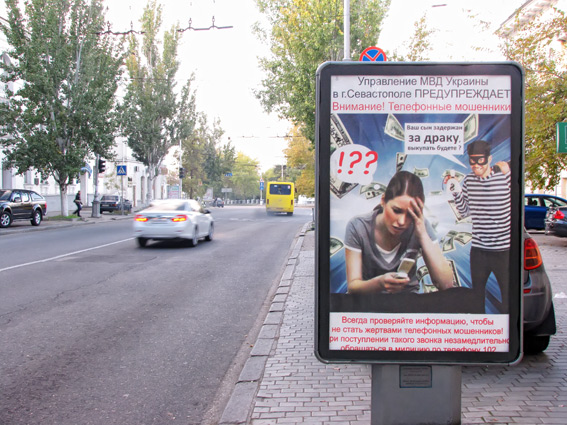 В Севастополе появились первые сити-лайты призывающие горожан не поддаваться на ловушку телефонных мошенников. Они расположены на центральном кольце города. В ближайшее время сити-лайты будут размещены и в других районах города. Об этом сообщает пресс-служба ГУ МВД Украины в Севастополе.