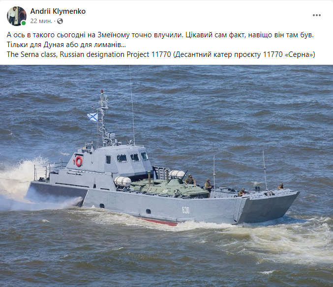 «А вот в такого сегодня на Змеином точно попали. Интересен сам факт, зачем он там был. Только для Дуная или для лиманов…» The Serna class, Russian designation Project 11770 (Десантный катер проекта 11770 «Серна»)», – пишет он.