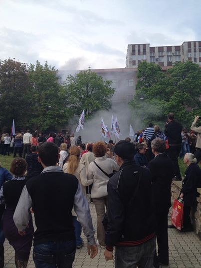 В четверг днем пророссийски активисты проводили марш, в ходе которого звучали призывы штурмовать прокуратуру, поскольку она “поддерживает киевскую хунту”. Спустя какое-то время они побежали к зданию прокуратуры, однако им воспрепятствовал кордон правоохранителей в защитном обмундировании и со щитами.