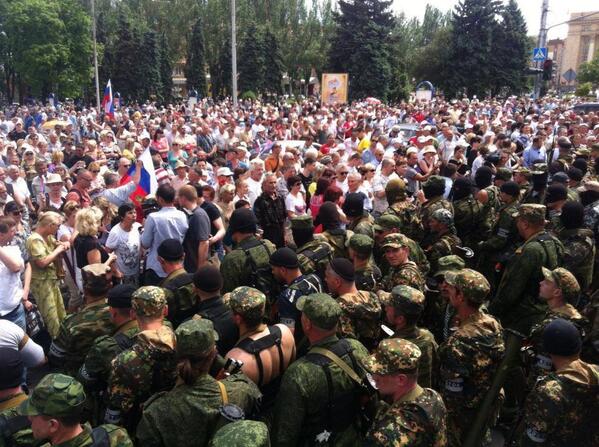 421043D0438043C043E043A044D043A04400430043D043002014-05-254320124838_zps639ef21fВ Донецке на площади Ленина около 2 тысяч человек собрались на митинг против проведения выборов президента Украины. Туда же прибыли бойцы батальона “Восток” – вооруженных сил сепаратистов.
