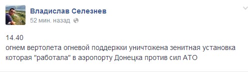 Позже он сообщил, что огнем вертолета огневой поддержки уничтожена зенитная установка, которая “работала” в аэропорту Донецка против сил АТО.