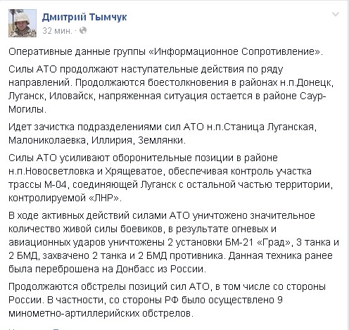 В ходе активных действий силами АТО за минувшие сутки уничтожено значительное количество живой силы боевиков. Об этом сообщает руководитель группы “Информационное сопротивление” Дмитрий Тымчук на своей странице в Facebook.