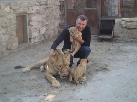 У художника есть свой мини-зоопарк со львами, рысью и медведем. С двумя царями зверей — львицей Катей и львом Самсоном — он будет жить бок о бок в вольере на 36 квадратных метрах. За его жизнью со львами можно будет следить в онлайн-режиме на сайте зоопарка (homezoo.com.ua), там же будет счет для благотворительности.