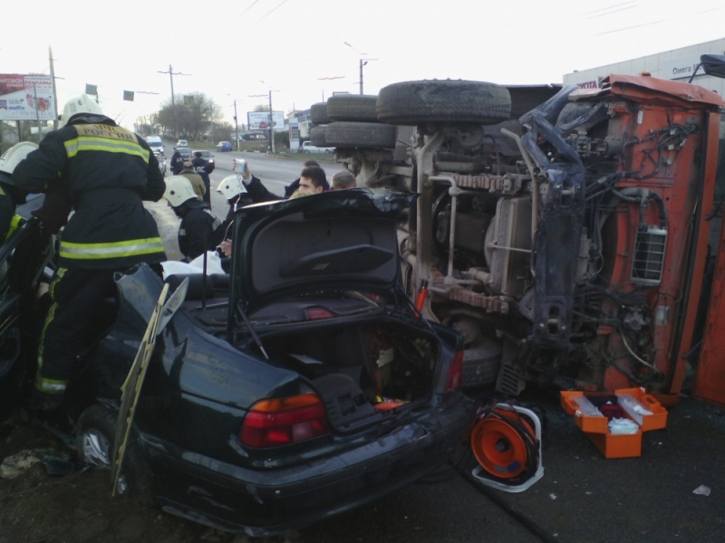 В Севастополе автомобиль BMW не уступил дорогу и столкнулся с КАМАЗом. Грузовик от удара перевернулся. Один человек погиб.
