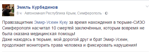 “Правозащитник Эмир-Усеин Куку за время нахождения в тюрьме-СИЗО Симферополя насчитал 10 смертей заключённых, которым вовремя не была оказана медицинская помощь! Даже находясь в тюрьме, мой дорогой друг и брат Эмир-Усеин, продолжает мониторить права человека и фиксировать нарушения!”, – написал Курбединов.