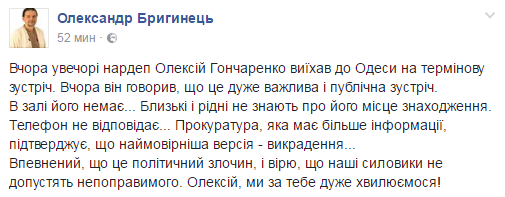 О похищении Гончаренко также сообщил его коллега из фракции БПП Александр Бригинец.