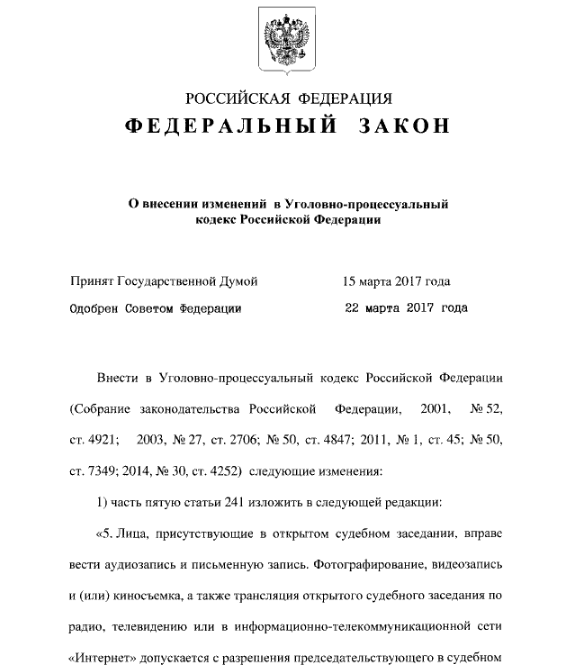 Президент России Владимир Путин подписал закон «О внесении изменений в Уголовно-процессуальный кодекс Российской Федерации», который позволяет российским судам ограничивать ведение СМИ трансляции судебных заседаний.