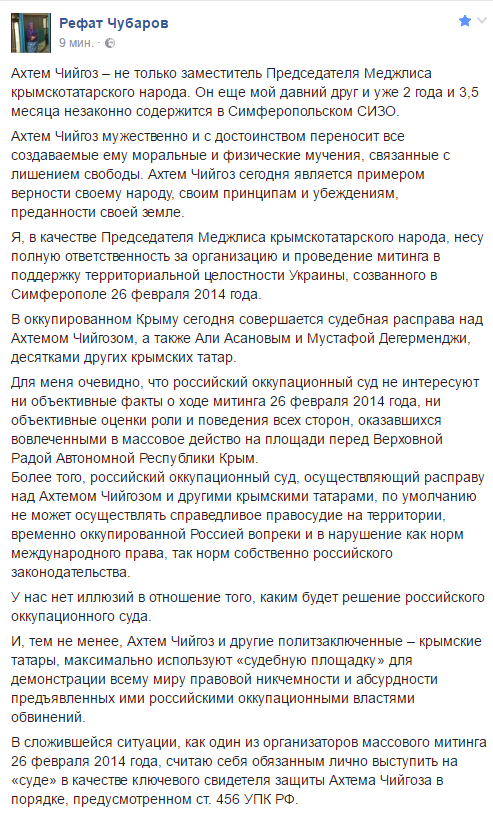 “В сложившейся ситуации, как один из организаторов массового митинга 26 февраля 2014 года, считаю себя обязанным лично выступить на «суде» в качестве ключевого свидетеля защиты Ахтема Чийгоза в порядке, предусмотренном ст. 456 УПК РФ. Я, в качестве Председателя Меджлиса крымскотатарского народа, несу полную ответственность за организацию и проведение митинга в поддержку территориальной целостности Украины, созванного в Симферополе 26 февраля 2014 года”, – написал он.