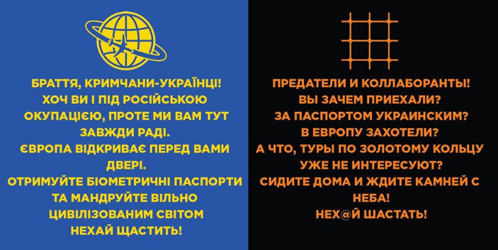 Активисты «Itchy trigger finger Ukrainians» разместили в Херсоне билборды с обращениям к крымчанам-предателям, которые попытаются получить биометрический паспорт, чтобы воспользоваться безвизовым режимом с Евросоюзом.