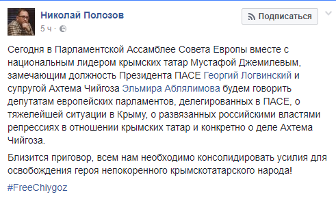 «Сегодня в Парламентской Ассамблее Совета Европы вместе с национальным лидером крымских татар Мустафой Джемилевым, замещающим должность Президента ПАСЕ Георгием Логвинским и супругой Ахтема Чийгоза Эльмирой Аблялимовой будем говорить депутатам европейских парламентов, делегированным в ПАСЕ, о тяжелейшей ситуации в Крыму, о развязанных российскими властями репрессиях в отношении крымских татар и конкретно о деле Ахтема Чийгоза», – написал адвокат.