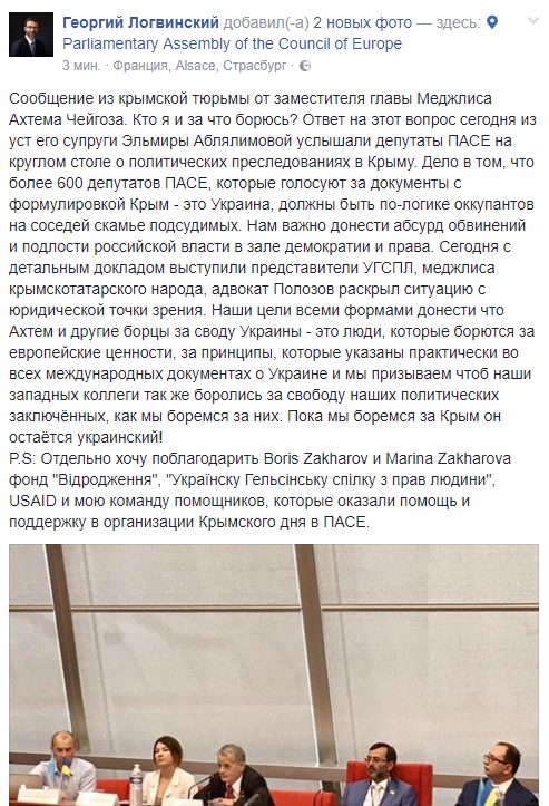 «Ахтем и другие борцы за свободу Украины – это люди, которые борются за европейские ценности, за принципы, которые указаны практически во всех международных документах об Украине и мы призываем чтобы наши западные коллеги так же боролись за свободу наших политических заключенных, как мы боремся за них. Пока мы боремся за Крым, он остается украинским!», – процитировал Аблялимову временно исполняющий обязанности президента ПАСЕ Георгий Логвинский.