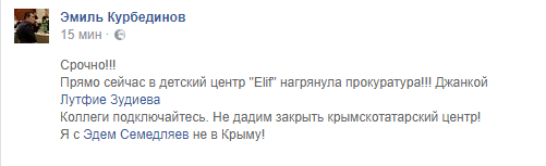 “Срочно!!! Прямо сейчас в детский центр “Elif” нагрянула прокуратура!!! Джанкой Лутфие Зудиева. Коллеги подключайтесь. Не дадим закрыть крымскотатарский центр! Я с Эдем Семедляев не в Крыму!”. – написал он.