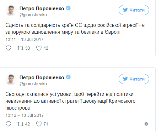 «Єдність і солідарність країн ЄС по російській агресії є запорукою відновлення миру і безпеки в Європі. Сьогодні склалися всі умови для переходу від політики невизнання до активної стратегії деокупацію Кримського півострова», – йдеться в повідомленні Порошенко.