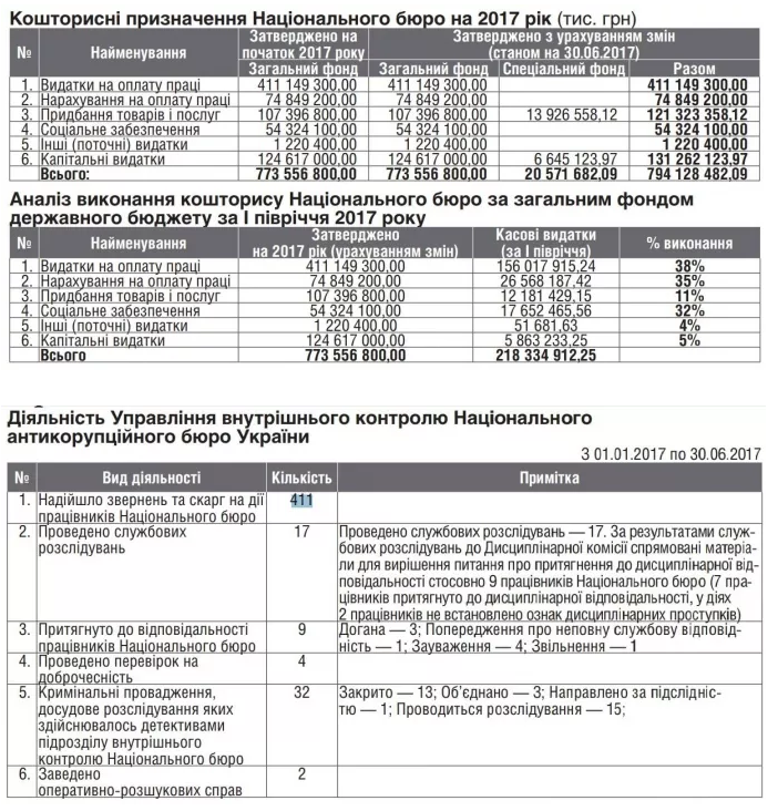 На 2017 рік з бюджету виділено 794,1 млн грн на діяльність НАБУ. За першу половину цього року бюро витратило 218,3 млн грн.