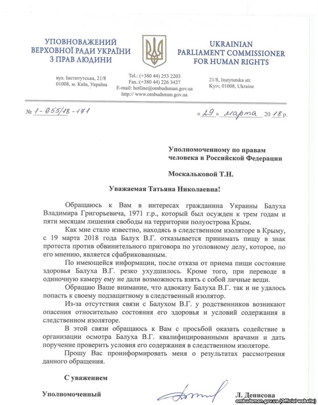 «Звертаюся до Вас в інтересах громадянина України Балуха Володимира Григоровича, 1971 р.н. … Як мені стало відомо, Володимир Балух, який знаходиться в слідчому ізоляторі в Криму, з 19 березня 2018 року відмовляється від їжі на знак протесту проти обвинувального вироку по кримінальній справі , яке, на його думку, є сфабрикованою. До нас надійшла інформація, що після відмови від їжі стан здоров’я Балуха різко погіршився. Крім того, після його перекладу в одиночну камеру йому не дозволили взяти з собою особисті речі», – йдеться в тексті звернення Денисової.