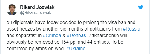 «Сьогодні дипломати ЄС вирішили продовжити термін дії візового заборони і заморозити активи ще на шість місяців проти політиків з Росії і сепаратистів у Криму та на Донбасі», – написав Йозвяк.