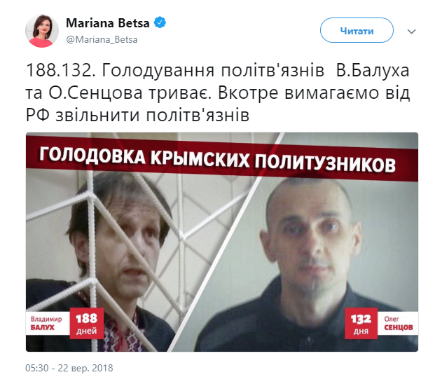 «Голодування політв’язнів В. Балуха і О. Сенцова тривають. В черговий раз вимагаємо від Росії звільнити політв’язнів», – написала Беца.