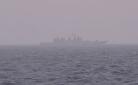 Російський ракетний фрегат, рухається в напрямку Азовського моря приблизно за 1,5 морських миль (2,4 км) від узбережжя окупованої Росією Феодосії.