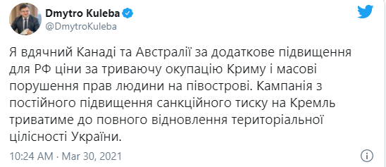 «Я вдячний Канаді та Австралії за додаткове підвищення для РФ ціни за триваючу окупацію Криму і масові порушення прав людини на півострові. Кампанія з постійного підвищення санкційного тиску на Кремль триватиме до повного відновлення територіальної цілісності України», – написав Кулеба.