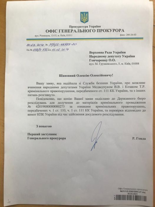 «ДБР відкрила кримінальне провадження про державну зраду Медведчука і Козака. Таку інформацію я отримав від Офісу Генпрокурора у відповідь на мою заяву про вчинення дій Медведчуком і Козаком, які підпадають під статтю 111 Кримінального Кодексу України (державна зрада). Мою заяву долучили до матеріалів кримінального провадження, яке уже ведеться Державним бюро розслідувань», – написав депутат.