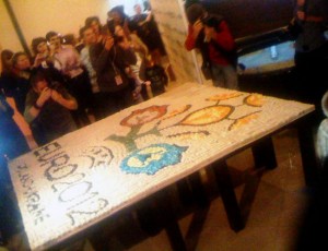 В Севастополе вчера вечером в одном из ресторанов изготовили самое большое в Украине панно из суши в виде логотипа Евро-2012. Общая площадь панно составила 4,66 кв. м, ширина – 1,97 м, длина – 2,33 м.