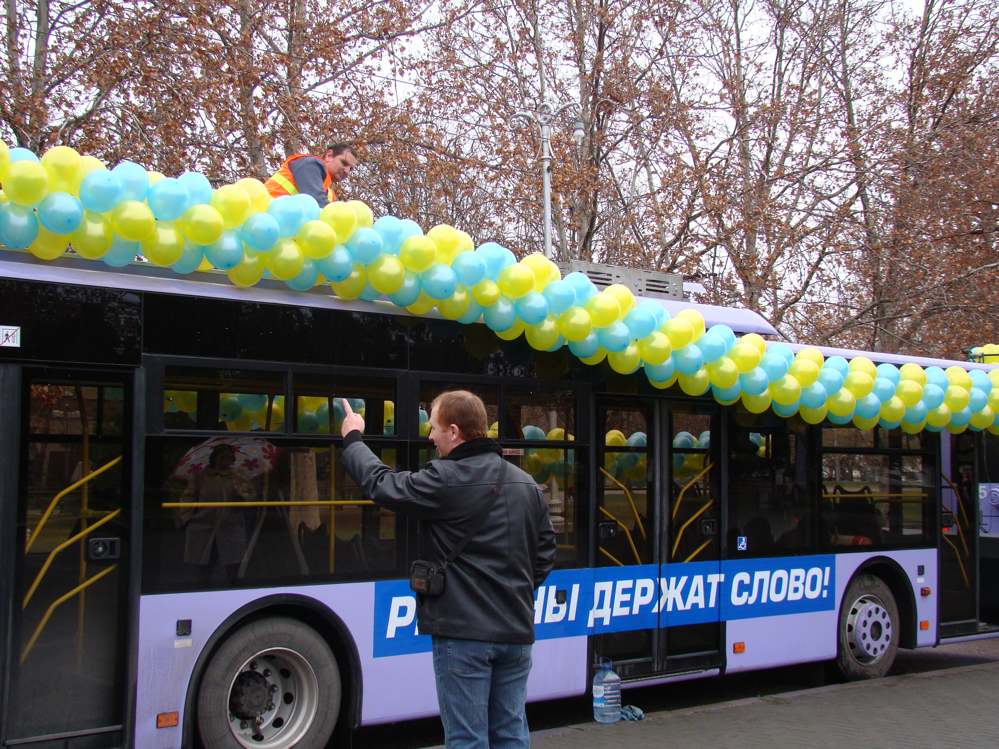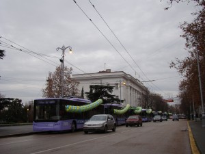 К открытию новогодней елки в Севастополь прибыли 10 новых троллейбусов, закупленных у Львовского автобусного завода. С утра машины уже выстроились на ул. Ленина и водители КП «Севэлектротранс» старательно украшали троллейбусы воздушными шарами.