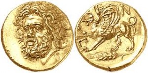 Еще одни ценный экспонат — статер из Пантикапея (ныне Керчь), на монетке изображена взъерошенная мужская голова. Предварительная оценочная стоимость этой монеты — 650 тысяч долларов.