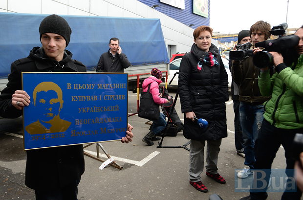 Активисты «Братства» совместно с националистическими организациями «Патриот Украины» и «Социал-националистическая ассамблея» подали заявку на проведение акции в мэрию Киева. В 12:00 они собрались возле входа в ТЦ «Караван» на улице Луговая. С собой активисты взяли табличку из фанеры под стеклом с надписью: «В этом магазине покупал и стрелял украинский неогайдамака Ярослав Мазурок».