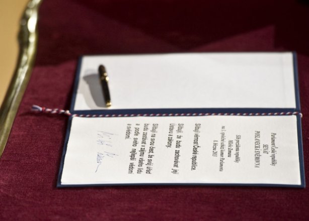 Земан произнес присягу, положив руку на Конституцию, а затем подписал сам текст присяги.