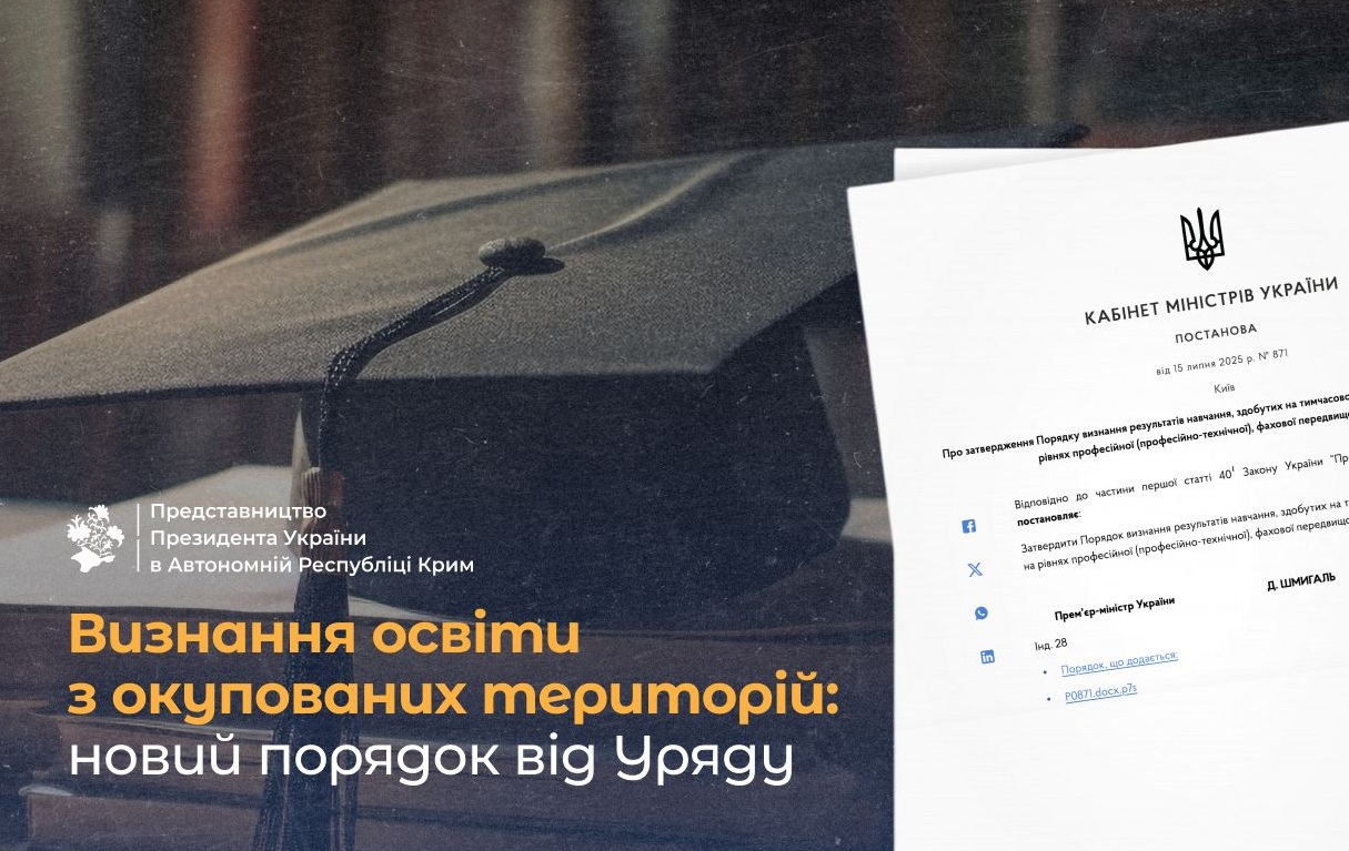 Уряд 15 липня затвердив постанову, яка встановлює чіткий механізм визнання результатів навчання, здобутих на тимчасово окупованих територіях України, у тому числі в Криму. Новий порядок охоплює професійну, фахову передвищу та вищу освіту.