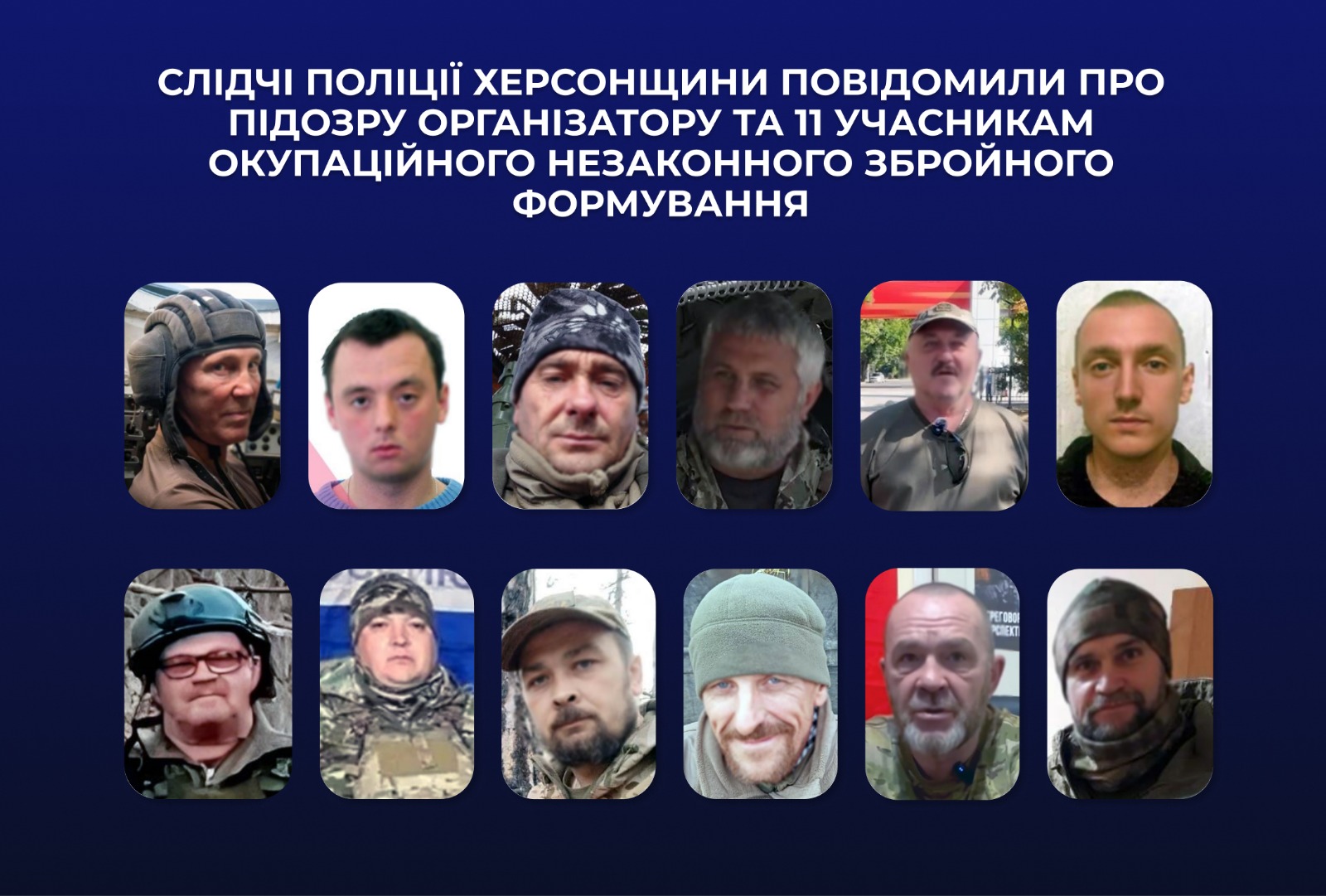 Як зазначається, особи учасників цього «добровольчєского батальйону» ідентифікували оперативники обласного управління СБУ. Серед зловмисників п’ятеро жителів ТОТ АР Крим, двоє колишніх жителів Одеси, один херсонець, ще двоє чоловіків із тимчасово окупованого лівобережжя Херсонщини та один із Донеччини.